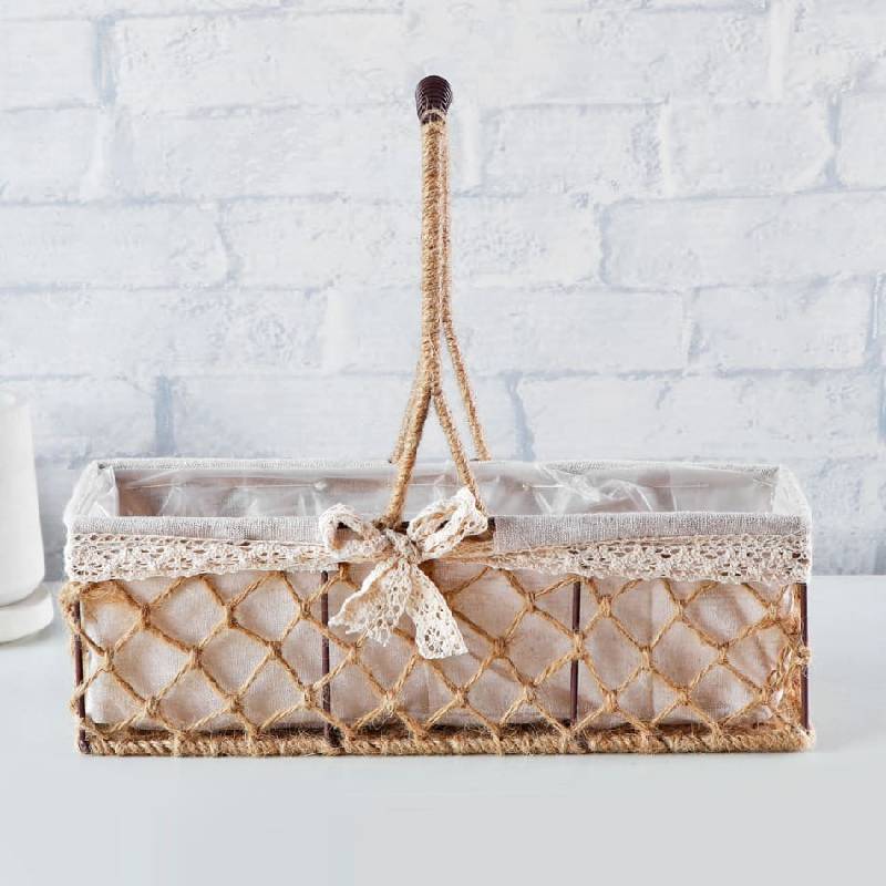 Loved and remembered, your heartfelt wishes carried in a rustic and humble english garden basket. Crafted with love by the artisan-Disbud, white roses, blush pink roses, white carnation white, spray carnation, english fern, and kamini